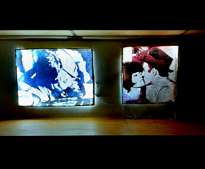 Scherenschnitt auf Farbkopie, Lichtboxes 60 x 80 cm und 60 x 70 cm